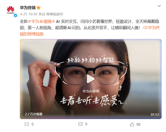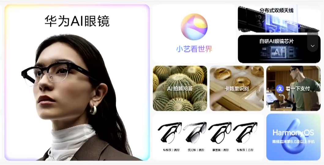 AI交互层面,眼镜内置小艺智能体,可实现AI实时视频交互,用户能够与小艺直接对话获取信息与服务。