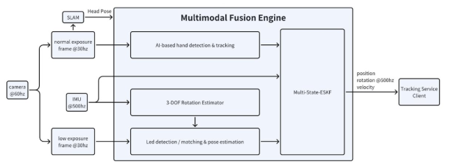 为了率先实现Centaur多模态追踪算法的产品化,PICO组建了跨部门的攻关小组,包括手柄追踪算法团队、裸手追踪算法团队和交互数据团队。经过多次论证后,最终实现了一套基于神经网络的多模态手柄追踪框架,其融合了惯性测量单元(IMU)、光学传感器和手部图像信息。