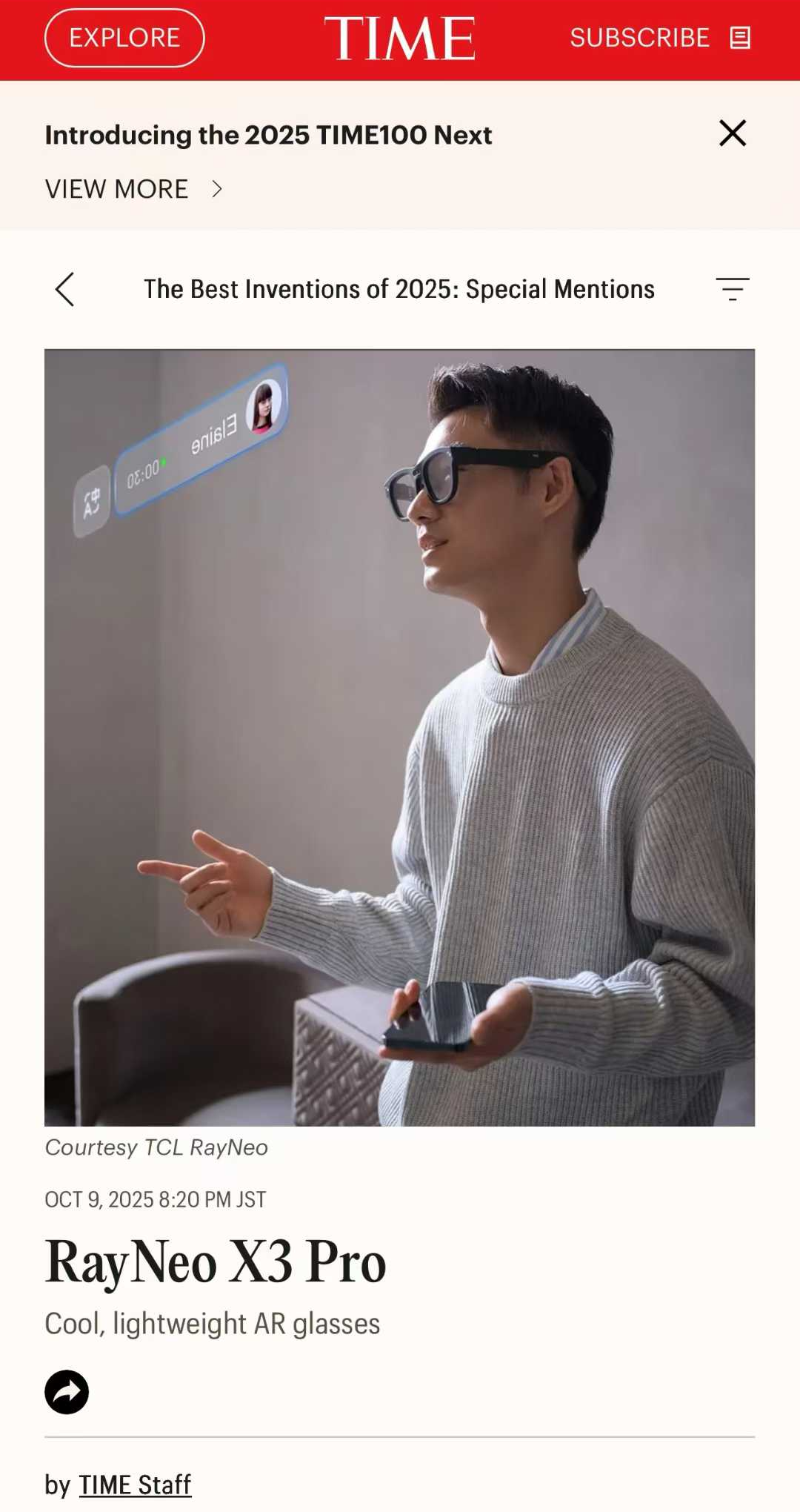 《时代》杂志作为全球权威媒体,此次雷鸟RayNeo X3 Pro入选榜单,正是对其技术突破性与行业引领性的认可。