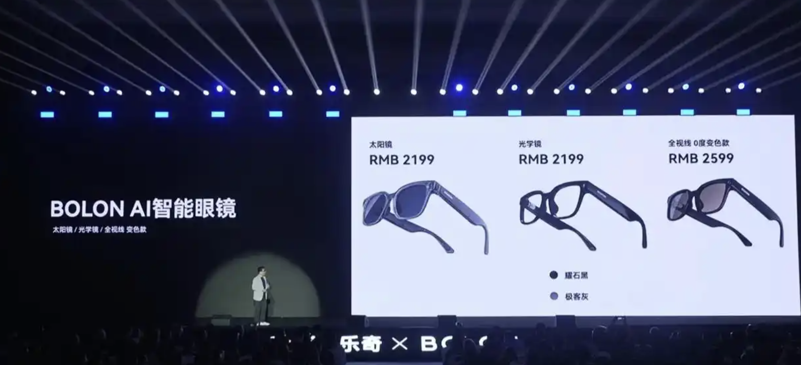 据悉,本次 Rokid 乐奇 × 暴龙新品“BOLON AI 智能眼镜”售价 2199 元起,拥有太阳镜款、光学镜款、全视线变色款,并提供曜石黑、极客灰两款配色。太阳镜:2199 元;光学镜:2199 元;全视线 0 度变色款:2599 元。