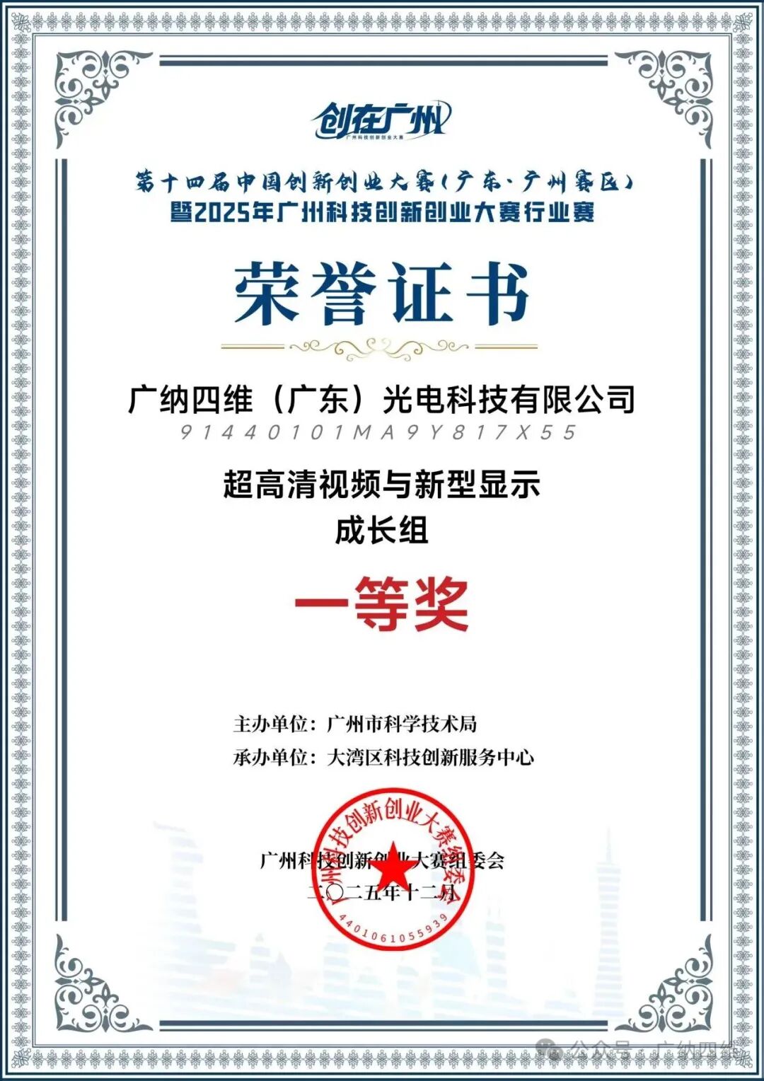 近日,广纳四维在第十四届中国创新创业大赛(广东·广州赛区)暨2025年广州科技创新创业大赛中,凭借在AR衍射光波导领域的硬核创新与量产实力,荣膺「超高清视频与新型显示」赛道一等奖。